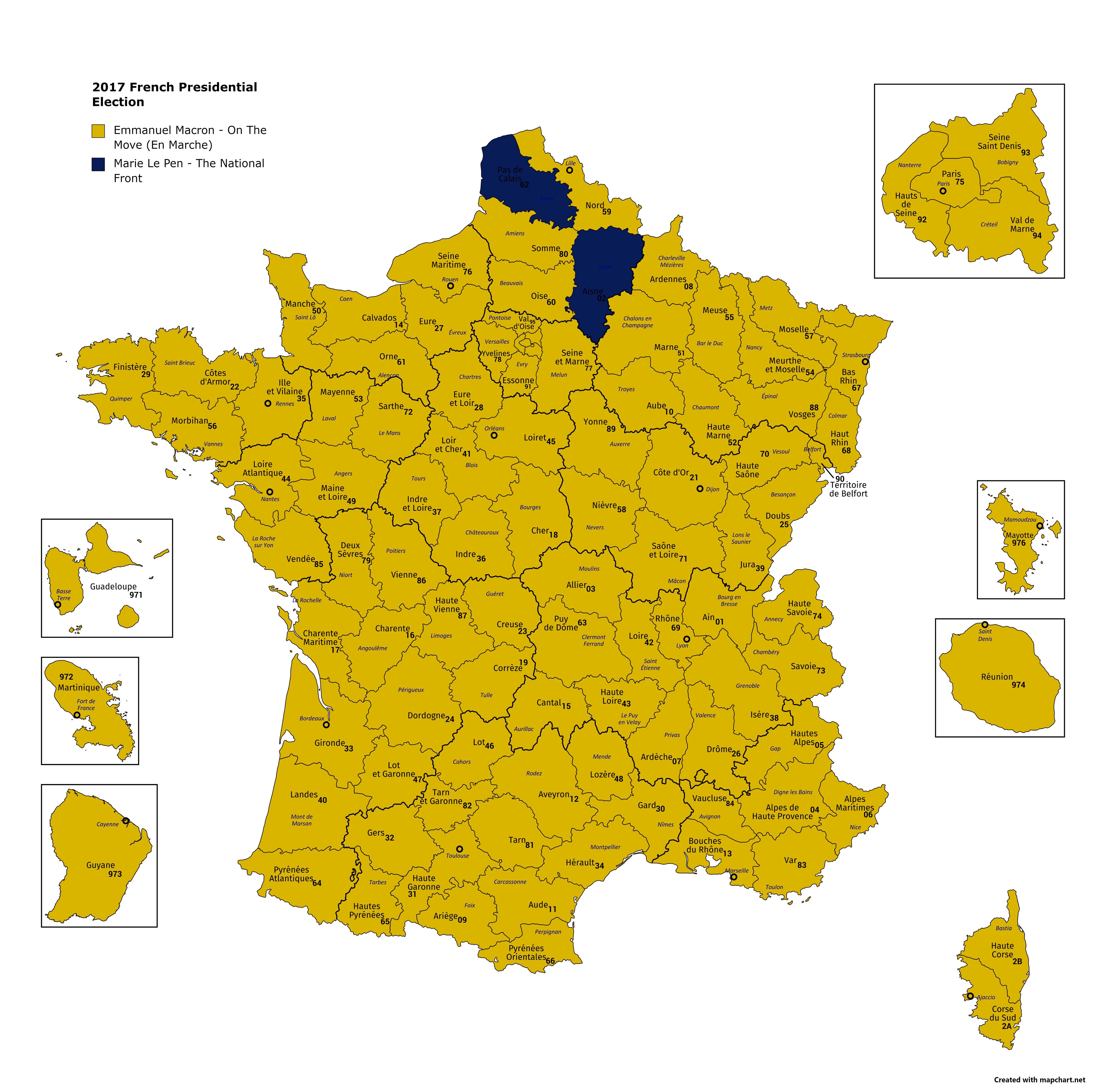 As no candidate won a majority in the first round, a runoff was held . The 2017 french presidential election was held on 23 april and 7 may 2017. Whether you're looking to learn more about american geography, or if you want to give your kids a hand at school, you can find printable maps of the united Voters in france went to the polls on sunday in the first round of the presidential election. The bars below display the range of outcomes that each candidate could achieve on election day, given the current standings. A map legend is a side table or box on a map that shows the meaning of the symbols, shapes, and colors used on the map. Find all the results from the first round of france's presidential election, by region, on our interactive map. The top two candidates, independent emmanuel . Charts always take center stage during an election—and this year’s were especially creative and informative. The second (and decisive) round of this year's french presidential election has led to a decisive victory of emmanuel macron of the .
